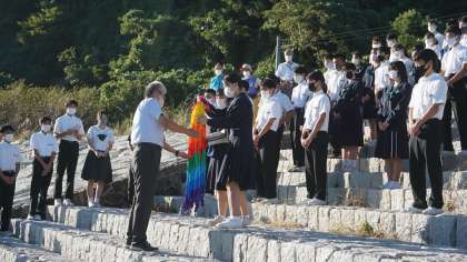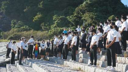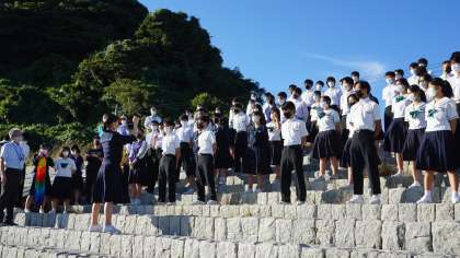 大津島の海岸沿いで、平和セレモニーを行いました。