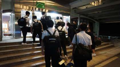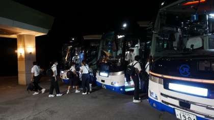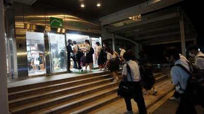 入所式を行うホテルの多目的ホールに集合・整列です。