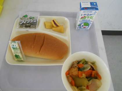 本日の献立は、コッペパン、ソフトマーガリン、豚肉とイカの中華煮、大学イモ、ミニフィッシュ、牛乳です。