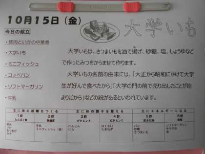 本日の献立に登場した「大学イモ」は、サツマイモを油で揚げてから、砂糖、塩、醤油などでつくったみつをからませて、つくります。
