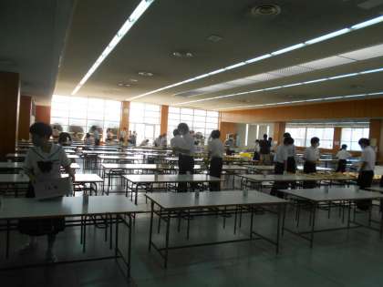 (写真は、昼食ホールでの2年生の給食準備の様子です。)