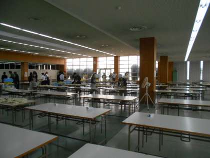 (写真は、昼食ホールでの1年生の給食準備の様子です。)