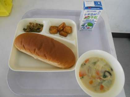 本日の献立は、黒糖パン、白菜のクリーム煮、厚揚げのゴマ醤油かけ、豚肉とさんど豆のオイスター炒め、牛乳です。