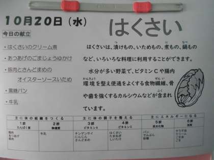 本日の献立に登場した「白菜のクリーム煮」に使われている「白菜」は、水分が豊富な野菜で、ビタミンCや食物繊維、カルシウムなどが含まれています。