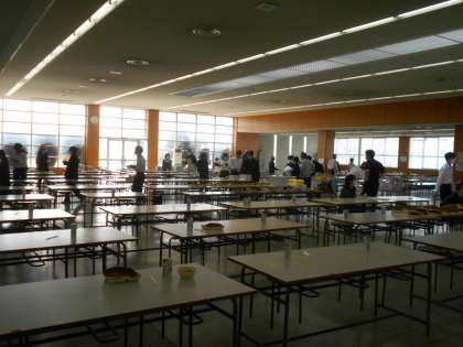 (写真は、昼食ホールでの2年生の給食準備の様子です。)