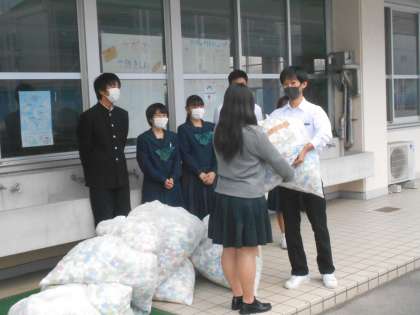 住吉中学校では、生徒会の取り組みとしてペットボトルキャップを集めています。これまで、何年間もため続けたペットボトルキャップを、建国高校の生徒会の皆さんが引き取ってくださいました。