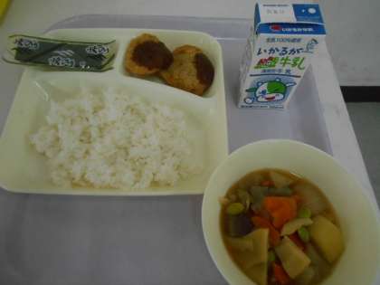本日の献立は、ごはん、焼きのり、鶏肉の香草焼き、みそカツ、ジャガイモと野菜の煮物、、牛乳です。