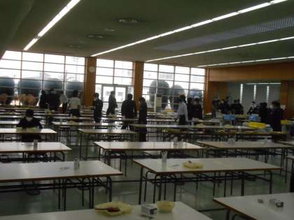 (写真は、昼食ホールでの2年生の給食準備の様子です。)