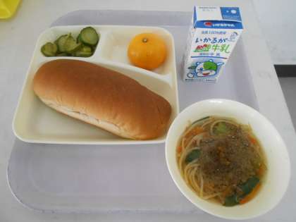 本日の献立は、黒糖パン、タンタンめん、キュウリの甘酢漬け、みかん、牛乳です。