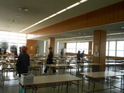(写真は、昼食ホールでの1年生の給食準備の様子です。)