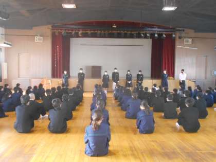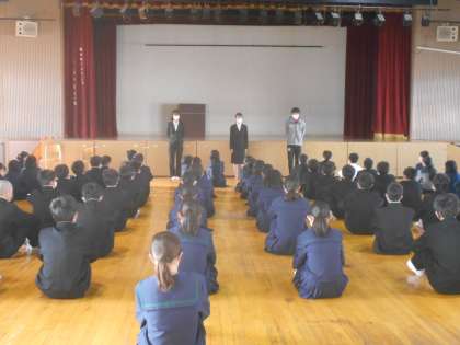 1年生の学年集会を講堂で行いました。1年生を担当する3名の教育実習生の皆さんから、ご挨拶がありました。また、代議員からの連絡がありました。