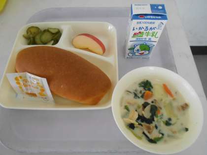 本日の献立は、コッペパン、マーマレード、キノコのクリームシチュー、キュウリのバジル風味サラダ、リンゴ、牛乳です。