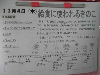 本日の献立に登場した「キノコのクリームシチュー」に使われている「キノコ」は、食用とされているものが100種類以上もあります。そのうちの約20種類が販売されており、その7割ほどが学校給食でも使われています。本日の献立「キノコのクリームシチュー」では、しめじ、エリンギ、マッシュルームが使われました。