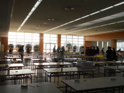 (写真は、昼食ホールでの2年生の給食準備の様子です。)