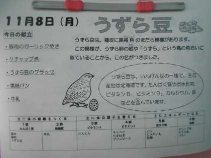 本日の献立に登場した「うずら卵のグラッセ」に使われている「うずら卵」は、卵の殻が鳥のうずらの色合いに似ていることから名前がついたと言われており、いんげん豆の一種で、主な産地は北海道です。