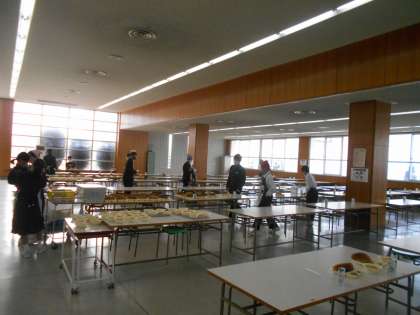 (写真は、昼食ホールでの1年生の給食準備の様子です。)