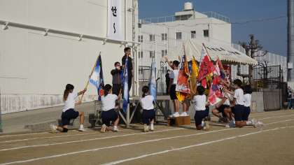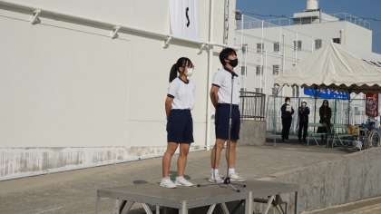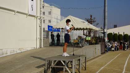 開会宣言を受けて、校歌斉唱ならびに校旗掲揚の後、選手宣誓、競技上の注意と開会式が進行していきます。