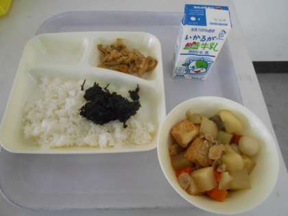 本日の献立は、ごはん、のりの佃煮、関東煮、レンコンの梅風味焼き、牛乳です。