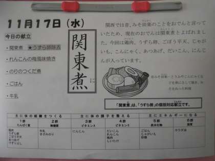 本日の献立に登場した「関東煮」は、関西では昔は「みそ田楽」のことを「おでん」と言っていたので、現在の「おでん」が「関東煮」と呼ばれました。本日の献立の「関東煮」には、鶏肉、うずら卵、ごぼう平天、じゃがいも。こんにゃく、厚揚げ、大根、にんじんが入っています。
