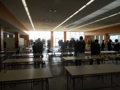 (写真は、昼食ホールでの2年生の給食準備の様子です。)