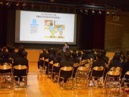 本日、5・6時限目に、2年生では「子ども将来のライフプラン支援事業」として、助産師を講師としてお迎えして、「性・生教育」を講堂で実施しました。