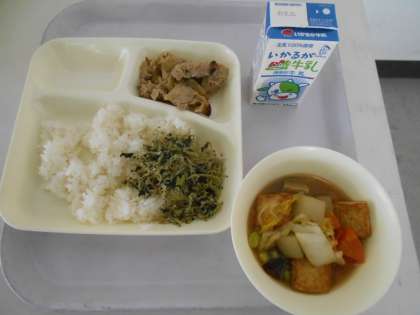 本日の献立は、じゃこ菜っ葉ごはん、豚肉のスタミナ焼き、厚揚げと冬野菜のあったか煮、牛乳です。