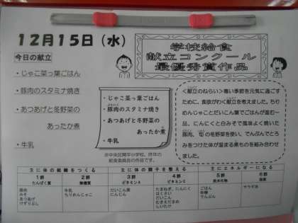 本日の献立は、学校給食献立コンクール最優秀賞作品となった献立で、寒い季節を元気に過ごすために、食欲がわくように考えられた献立となっています。