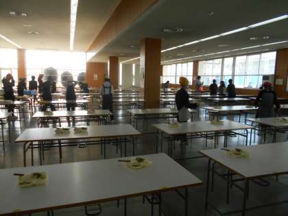 (写真は、昼食ホールでの1年生の給食準備の様子です。)