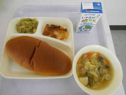 本日の献立は、黒糖パン、ポトフ、カレーソテー、桃のクラフティ、牛乳です。