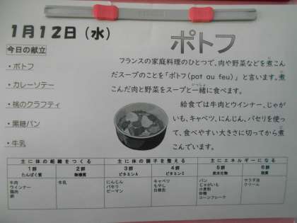 本日の献立で登場した「ポトフ」は、フランスの家庭料理のひとつで、肉や野菜などを煮込んだスープのことです。