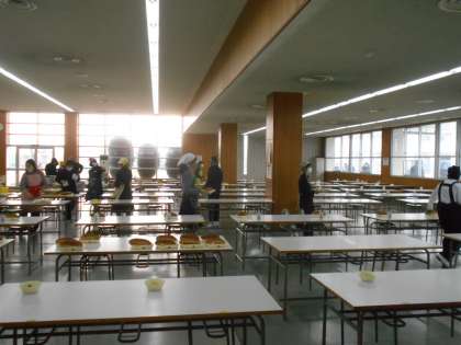(写真は、昼食ホールでの1年生の給食準備の様子です。)