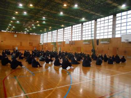 3年生の学年集会を体育館で行いました。進路指導主事の落合先生から、私立高校の受験、ならびに、1月24日(月)から始まる学年末テストについてのお話がありました。