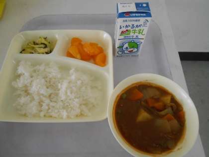 本日の献立は、ハヤシライス、キャベツのひじきドレッシング、みかん、牛乳です。