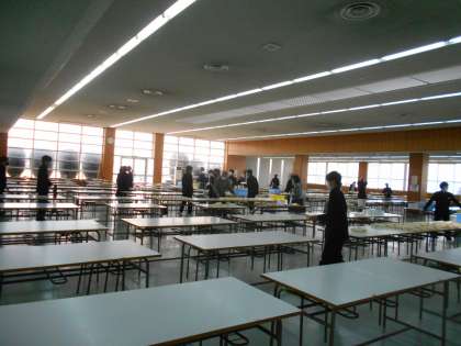 (写真は、昼食ホールでの2年生の給食準備の様子です。)