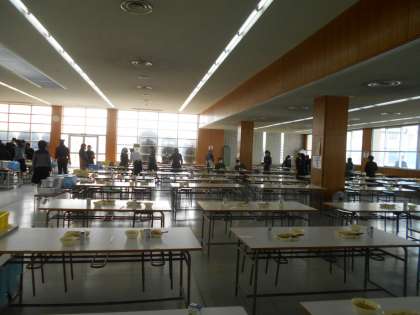昼食ホールでの1年生の給食準備の様子です。