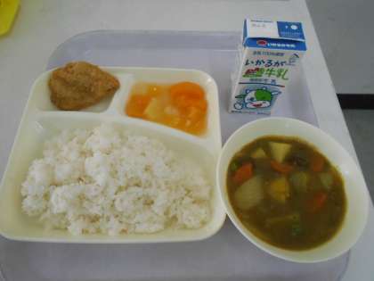 本日の献立は、「入学祝い献立」で、カツカレーライス、フルーツゼリー、牛乳です。