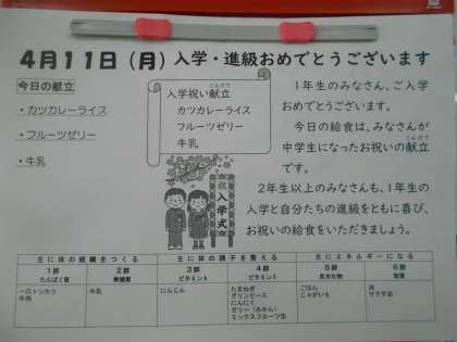 1年生が中学校へ入学してきたことを祝っての献立となっています。2年生・3年生が、それぞれ進級したことへのお祝いでもあります。