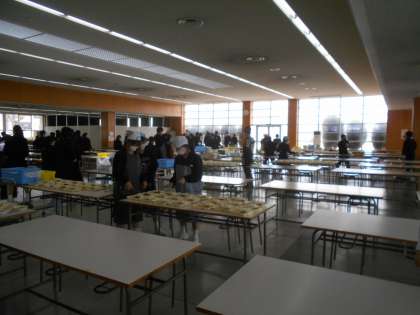 (写真は、昼食ホールでの1年生の給食準備の様子です。)
