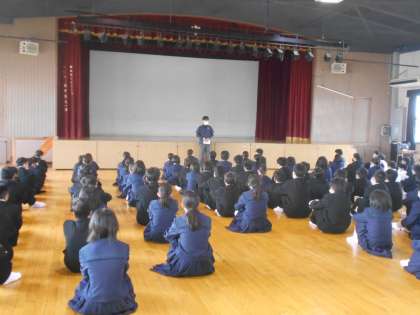 講堂で、1年生の学年集会を行いました。学年主任の山下先生から生徒手帳の内容についての説明がありました。