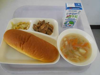 本日の献立は、パンプキンパン、豚肉のデミグラスソース、キャベツとコーンのソテー、スープ、牛乳です。
