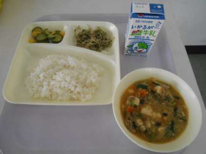 本日の献立は、ごはん、麻婆豆腐、もやしとピーマンのごま炒め、キュウリとコーンの甘酢和え、牛乳です。