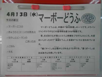 本日の献立に登場した「麻婆豆腐」は、中国の「四川料理」の一つです。トウバンジャンやトウチなどの香辛料を使うのが特徴です。