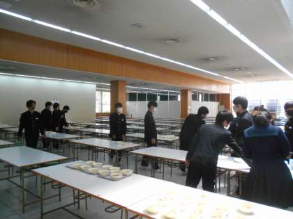 (写真は、昼食ホールでの3年生の給食準備の様子です。)