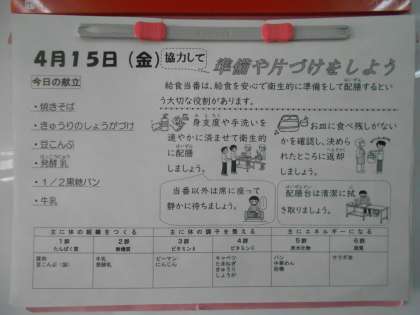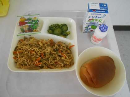 本日の献立は、黒糖パン、焼きそば、キュウリの生姜漬け、豆昆布、発酵乳、牛乳です。