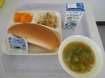 本日の献立は、コッペパン、ブルーベリージャム、マカロニグラタン、レタスのスープ、みかん、牛乳です。