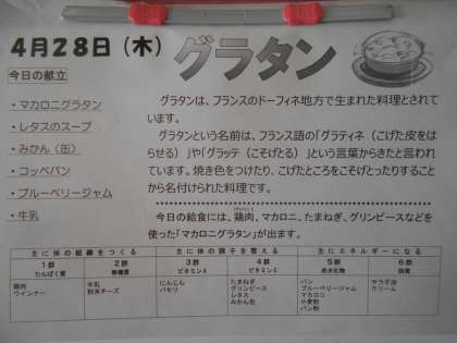 本日の献立「マカロニグラタン」の「グラタン」は、焼き色をつけたり、焦げたところをこそげとったりすることから名付けられ、フランスのドフィーネ地方で生まれた料理です。