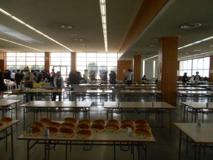 (写真は、昼食ホールでの1年生の給食準備の様子です。)