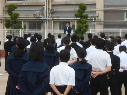 本日、上グランドで全校集会を実施しました。本日より着任した英語科教員の柳川笑子(やながわしょうこ)先生から、校長先生が紹介された後に、ご挨拶がありました。