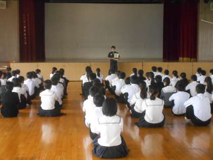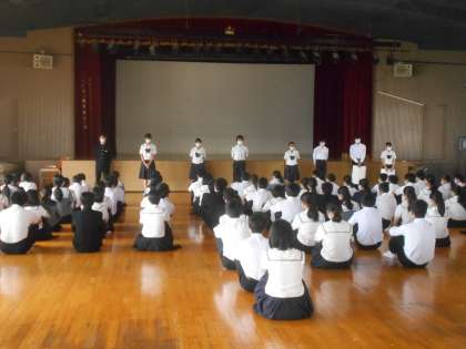2年生の学年集会を講堂で行いました。前期の代議員や学年代表からの挨拶と発表がありました。また、学年主任の安田先生からは、より良い学級づくりや学年づくりについてのお話がありました。