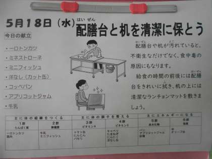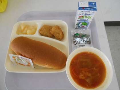 本日の献立は、コッペパン、アプリコットジャム、一口トンカツ、ミネストローネ、ミニフィッシュ、洋ナシ、牛乳です。